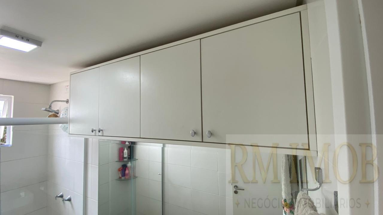 Banheiro funcional, com armários, box e ducha;